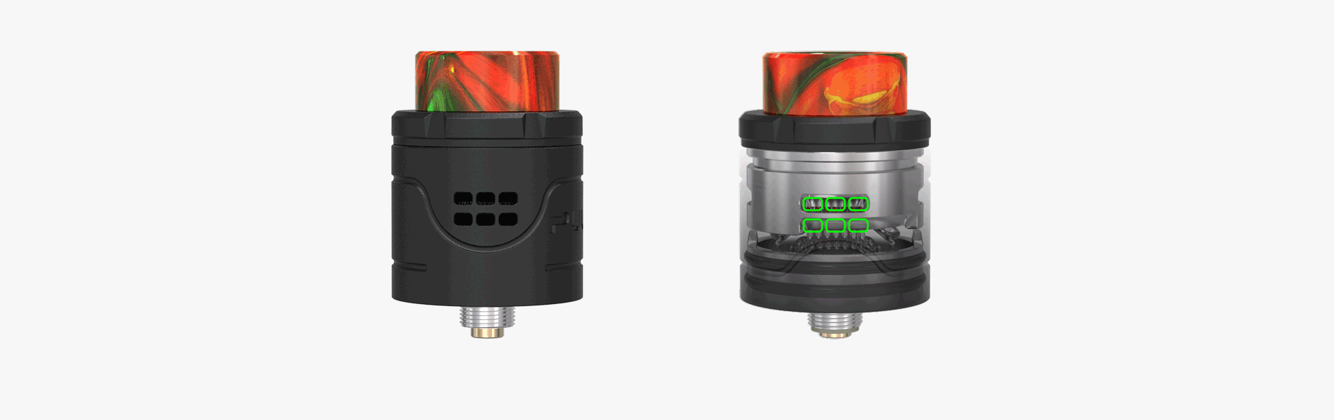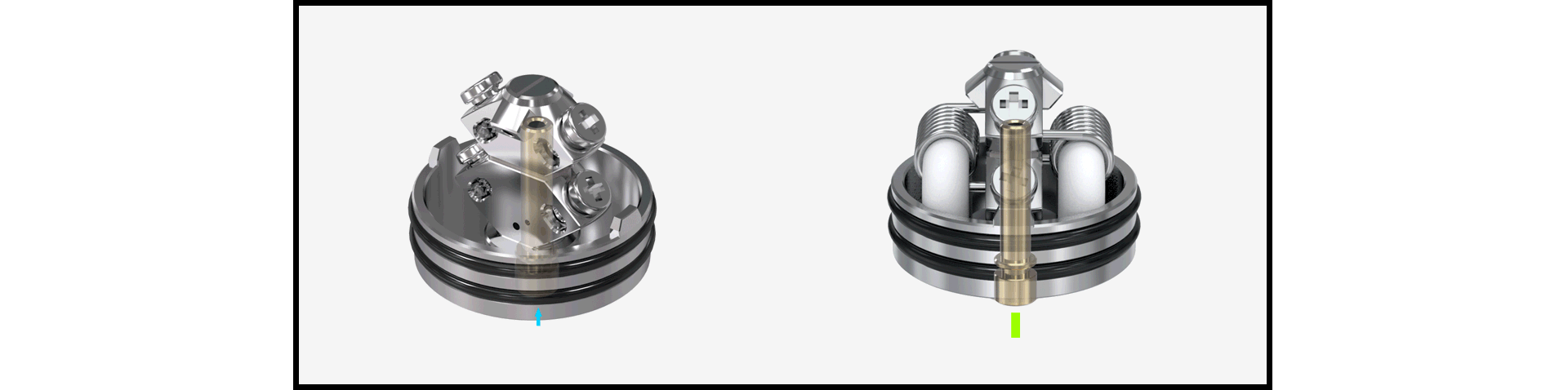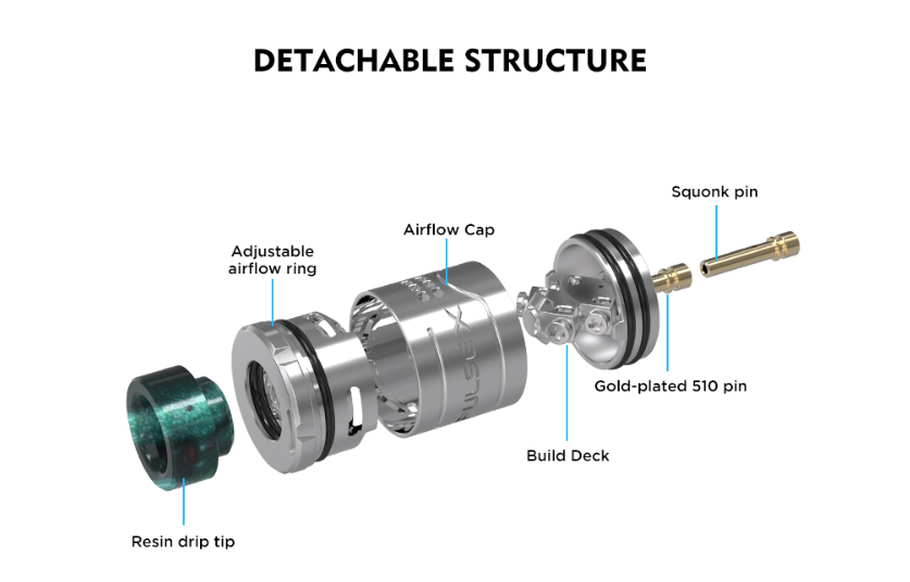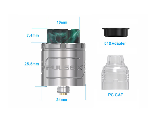 Le Pulse X est un RDA de 24 mm de diamètre bottom feeder et qui pourra contenir 2 ml de liquide. Son système BF est innovant et permet d'alimenter les coils par le dessus.